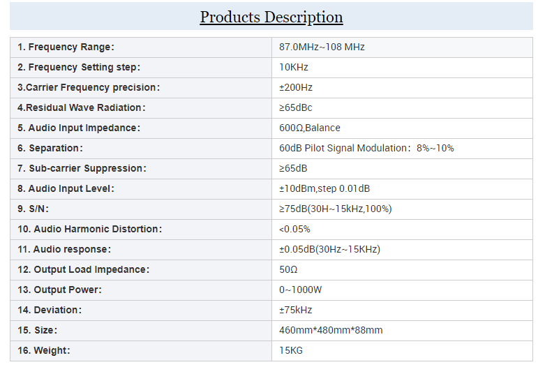 The RF out of this 1000w FM transmitter is continuously adjustable from 0-1000 watt at the stepping of 0.1watt, which means you can