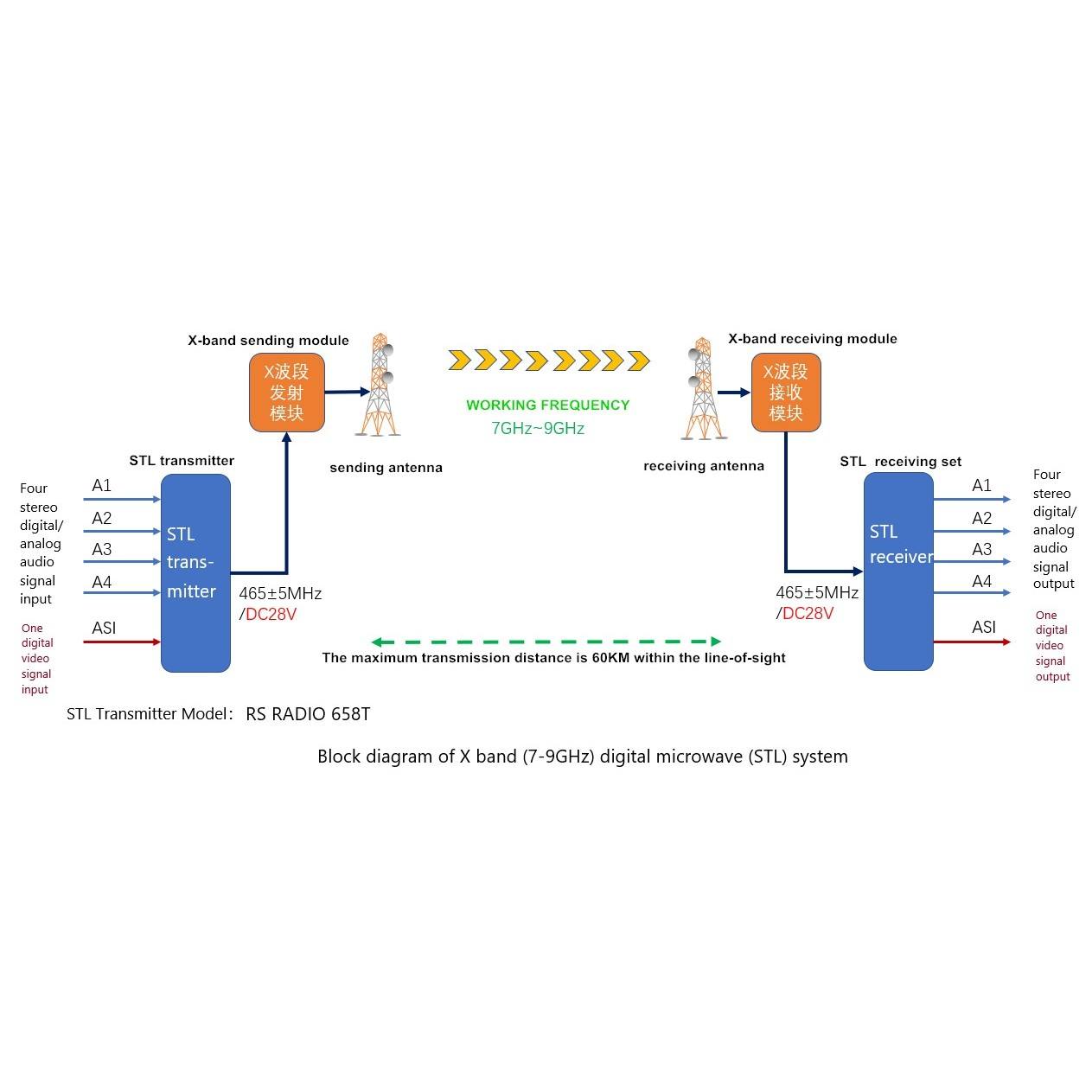 One set of standard configuration STL system equipment has a transmission distance of 60 kilometers in line of sight. The transmission system consists of STL transmitter, transmission filter, transmitting antenna & feeder cables, receiving antenna & feeder cables and STL receiver.